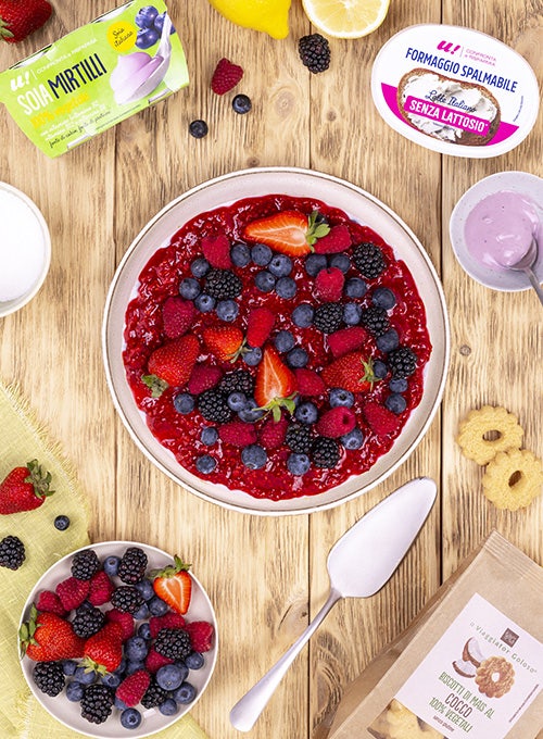- Unire anche la gelatina vegetale sciolta insieme alla maggior parte dei mirtilli, lasciandone da parte alcuni per la decorazione. Mescolare accuratamente il composto e versarlo nella tortiera con la base ormai compatta, quindi riporre in frigo per due ore.