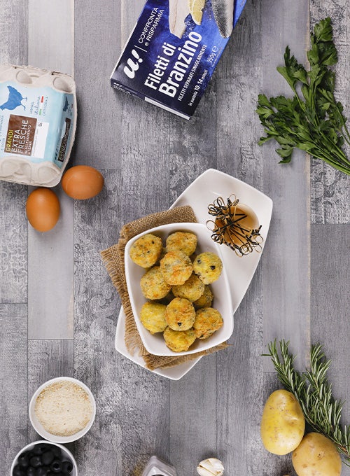 - Per preparare delle deliziose crocchette di patate, branzino e olive nere, trita le olive denocciolate e sminuzza il branzino cotto. Schiaccia le patate lessate in un recipiente, unisci il branzino, le olive, il prezzemolo tritato, sale e pepe, mescola bene e forma le polpette.