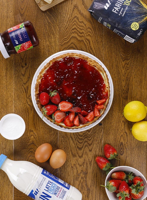 - Una volta che la crostata è pronta e si è raffreddata, spalma sopra uno strato di crema al latte e aggiungi le fragole fresche per decorare a piacere.