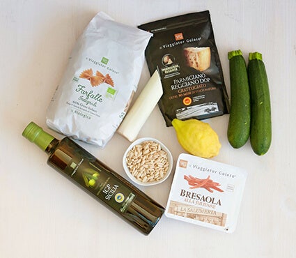 - Preparate le farfalle con zucchine in 4 ciotole, unite i pinoli e la bresaola, quindi cospargete il tutto con scorza di limone grattugiata.