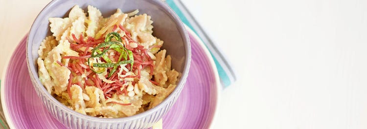 Per le giornate calde, questa è una ricetta fresca e deliziosa. Le farfalle integrali sono ricche di fibre e carboidrati complessi che saziano a lungo, mentre la crema di zucchine apporta vitamine e sali minerali ideali per restare in forma durante l'estate.