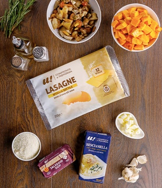 Utilizziamo la sfoglia sottile di pasta fresca all’uovo come base, alternando strati di besciamella, zucca arrostita, funghi saltati in padella, taleggio saporito e una spolverata di parmigiano grattugiato. Continua a comporre strato dopo strato questa ricca lasagna, arricchita dai sapori di tutti gli ingredienti.