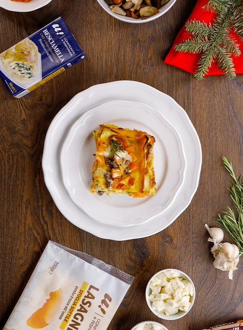 - In una pirofila, distribuisci delle noci di burro e inizia a comporre le lasagne posizionando le sfoglie di pasta sul fondo. Aggiungi uno strato di besciamella, qualche cucchiaio di zucca e funghi, quindi unisci il taleggio a pezzi e spolvera con parmigiano.