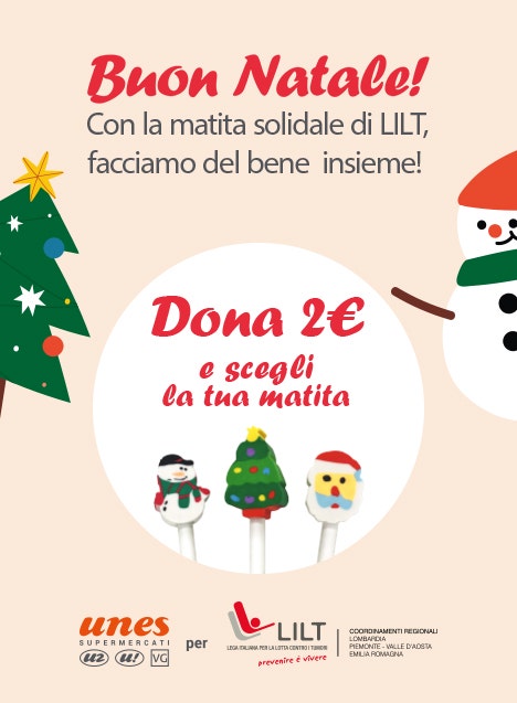 Durante il periodo dal 6 dicembre al 6 gennaio, presso i punti vendita aderenti all'iniziativa U2 Supermercato, U! Come tu mi vuoi e presso gli store il Viaggiator Goloso®, è possibile donare 2€ e ricevere in cambio una delle tre matite natalizie disponibili. Il ricavato sarà devoluto interamente alle sezioni LILT Lombardia, LILT Emilia-Romagna e LILT Piemonte-Valle d'Aosta per sostenere le attività di prevenzione, diagnosi precoce, assistenza ai malati e ricerca oncologica. Un piccolo gesto che può fare la differenza nella lotta contro i tumori. Scopri i punti vendita aderenti e contribuisci anche tu!