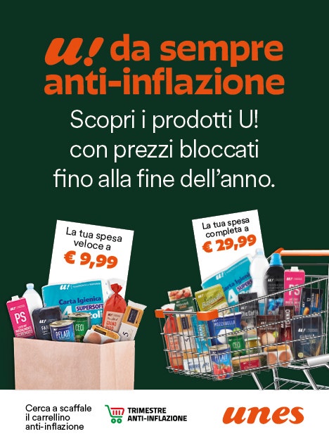 Con meno di 10 € puoi fare la spesa veloce con i prodotti U!, mentre per una spesa completa bastano meno di 30 €. Le referenze incluse nell'iniziativa sono contrassegnate dal bollino con il carrellino anti-inflazione. Scopri tutti i punti vendita Unes che aderiscono all'iniziativa "U! da sempre anti-inflazione".
